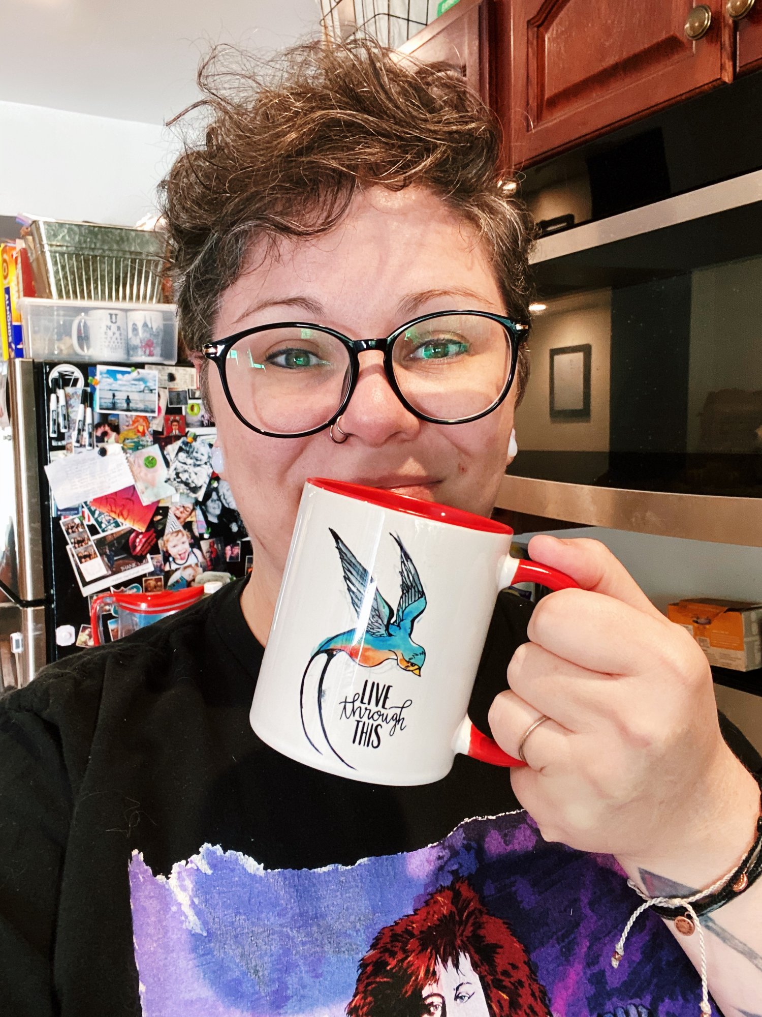Ceramic mug is dishwasher and microwave safe. Please allow 2 weeks for delivery. All proceeds go to Live Through This.