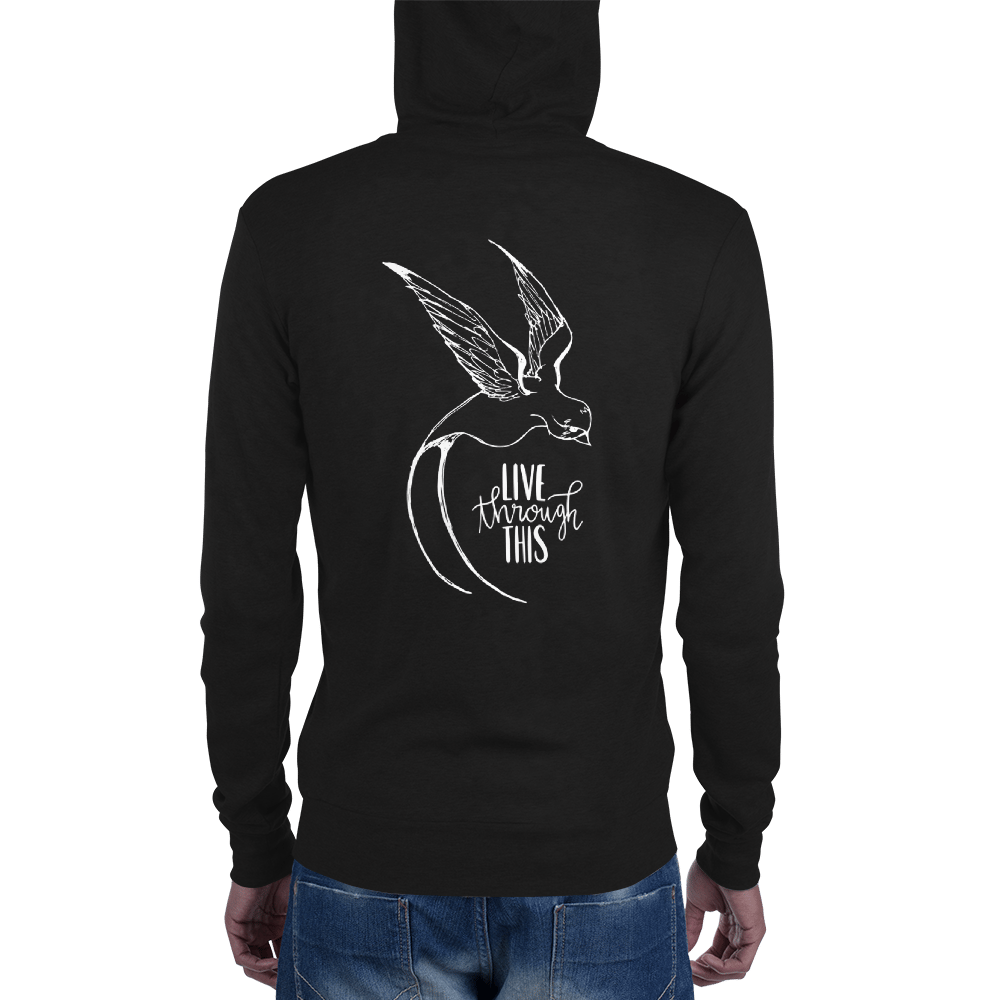 This Live Through This Sketch Logo Zip Hoodie is walking activism. If we're going to change public attitudes and work toward preventing 1.4 million suicide attempts in the U.S. in the next year (and saving the 47,000+ lives we will lose to suicide), we need to talk openly about it, without fear or shame. When someone asks what the hoodie's all about, tell 'em! The more open we can be, the more we can have productive conversations, and the more we can effect change.